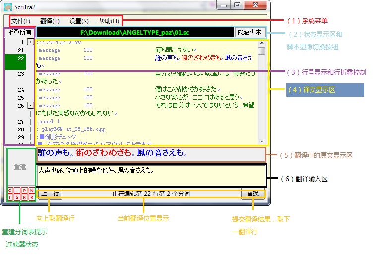 大概两周多前没事干想用ScriTra继续翻AT,结果觉得原版速度还是太慢了,而且因为是一边写一边想有不少冗余功能,于是就趁有空重写了一遍,精简了一些功能,增加了折叠功能和自动替换功能,并且提升了处理速度,当然,最重要的是,终于写了一个比较像样的帮助文档了(鼓掌)。