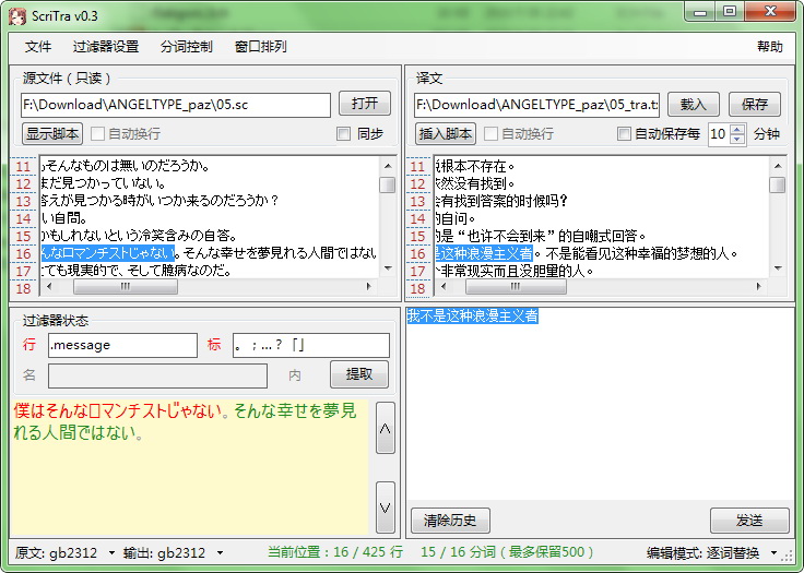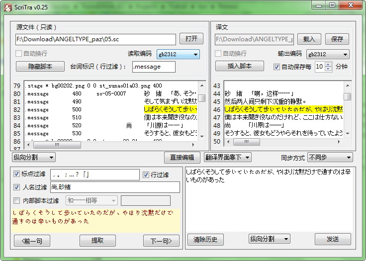2、直接编辑_隐藏行首脚本:把右下角设置为直接编辑,翻译窗会关掉,只剩下原文/译文窗。用户可以直接改写译文窗内的内容。点击两个窗口上对应的按钮可以进行行过滤,只显示以“行过滤器”为标记的台词行的内容。过滤状态下编辑后保存时会自动再次插入被过滤的脚本。勾上原文窗上的“同步”可以使原文和译文同步滚动。此模式除了能过滤一下非台词行、能用自动换行显示外啥处理都没。