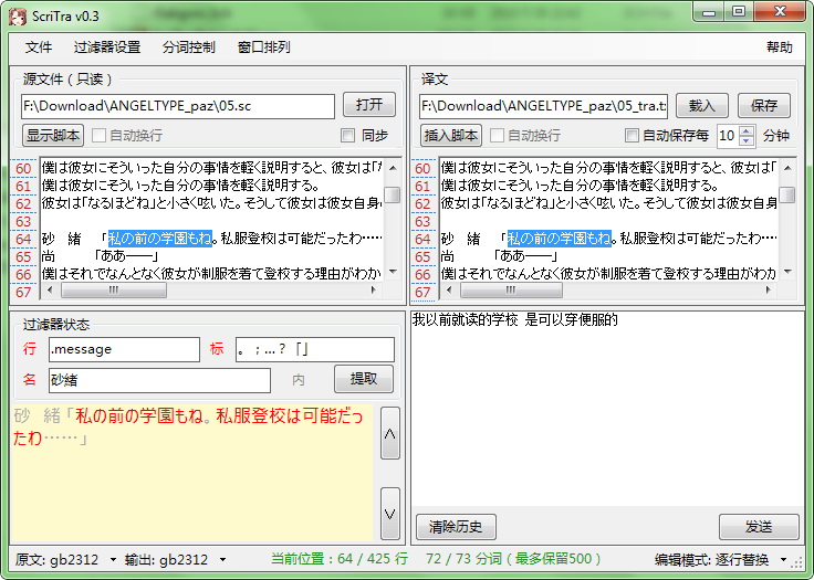 3、分词编辑:把右下角设置为“逐词替换”进入分词模式。翻译窗打开,译文窗变成只读。在设置好各个过滤器后,点提取(Ctrl+T)后开始进入分词编辑。程序会根据过滤器自动找出原文中合适的行,并把行中各分词以不同的颜色显示在显示窗里。其中红色代表当前正在被编辑(翻译)的词;绿色代表同一行内其他将要或已经被编辑过的分词;灰色则是被过滤掉的内容。在编辑窗里输入翻译内容后按发送(Ctrl+Enter),译文中对应的部分就会被编辑窗内容所替换掉,同时程序自动跳到下一个分词。若需要修改,可以用显示窗上的两个箭头按钮(PageUp/PageDown)进行历史回滚。